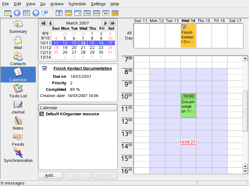 Kontact benytter KOrganizer som sin kalenderkomponent. For å konfigurere den bruker du . Med kalenderen legger du inn avtaler og planlagte møter med andre. Om ønskelig kan du bli minnet om hendelser som kommer. Du kan også importere, eksportere og arkivere kalendere med alternativene i .
