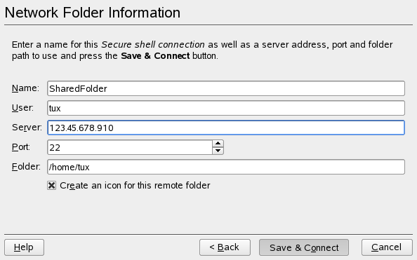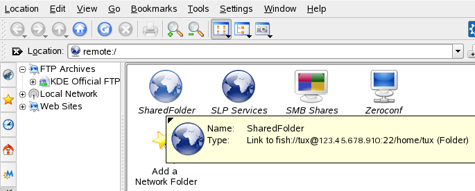 Med KNetAttach kan du også legge til nye nettverksmapper på denne visningen ved å klikke på i en Konqueror remote:/-visning. En veiviser åpnes, og her kan du velge hvilken type nettverksmappe du vil ha tilgang til, og skrive inn detaljene, som navn på nettverksmappen, adressen til serveren (enten IP-adressen eller domenenavnet), innloggingsnavnet og banen til mappen du vil ha tilgang til.