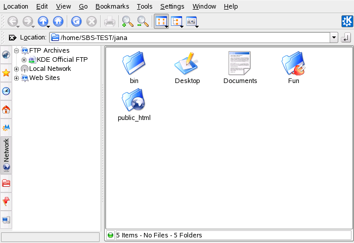 Andre medlemmer på nettverken kan få tak i den delte mappen ved å taste inn smb:// i plasseringslinjen i Konqueror, og deretter klikke på ikonet til arbeidsgruppen, og vertsnavnet arbeidsgruppe.
