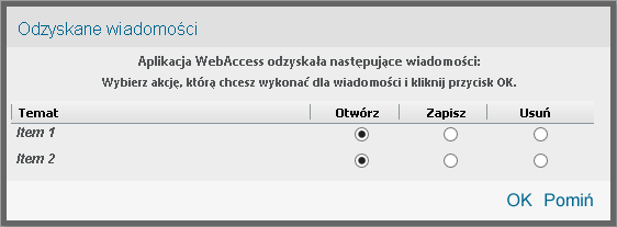 Kliknij opcję Pomiń, aby zachować zapisane wiadomości na dysku bez ich odzyskiwania w programie WebAccess. Po kolejnym uruchomieniu programu WebAccess okno automatycznego zapisywania zostanie wyświetlone ponownie.
