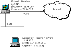 Quando o NAT está configurado dessa forma e pacotes de hosts públicos com um endereço de destino 198.76.28.11 ou 198.76.28.31 são recebidos pela interface habilitada pelo NAT no roteador NetWare, o NAT substitui o endereço de destino dos pacotes pelo endereço privado apropriado e reencaminha os pacotes para os hosts privados. Os pacotes de resposta dos hosts privados para os hosts públicos são submetidos à conversão inversa de endereços. Dessa forma, os hosts da rede pública podem acessar recursos específicos na rede privada, mas o acesso é limitado somente àqueles recursos que possuam seus endereços privados configurados na tabela de conversão de endereços de rede. Um host privado cujo endereço seja mapeado para um endereço público na tabela de conversão de endereços de rede também pode acessar qualquer host público.
