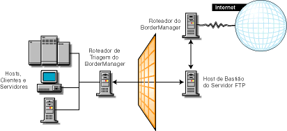 Um host de bastião executa somente alguns serviços (por exemplo, serviços de e-mail, FTP, DNS ou Web). Os usuários da Internet precisam utilizar o host de bastião para acessarem um serviço. Um host desse tipo não precisa de qualquer autenticação nem armazena qualquer dado confidencial da empresa.