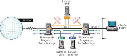 Um firewall pode conter vários componentes. O BorderManager fornece uma solução abrangente de firewall que inclui os seguintes serviços: