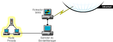 Neste exemplo, o servidor BorderManager e o roteador da WAN podem ser acessados a partir da Internet. Além disso, o servidor BorderManager funciona como um roteador de triagem na rede privada. Com o NAT e a filtragem de pacotes, o servidor BorderManager pode ser configurado para bloquear o tráfego em portas específicas e somente um número específico de serviços pode se comunicar com ele.