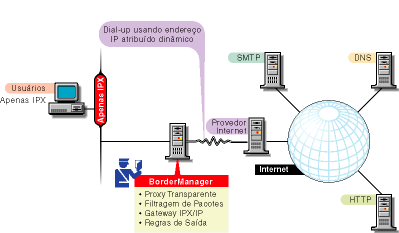Neste cenário, a Empresa Acme está executando apenas o IPX na rede. Ela deseja usar o BorderManager para permitir que somente os usuários da intranet acessem e procurem na Internet. A Acme tem os seguintes requisitos: