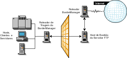 Um host de bastião executa somente alguns serviços (por exemplo, serviços de e-mail, FTP, DNS ou Web). Os usuários da Internet devem utilizar o host de bastião para acessarem um serviço. Um host desse tipo não precisa de qualquer autenticação nem armazena qualquer dado confidencial da empresa.