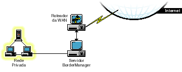 Neste exemplo, o servidor BorderManager e o roteador da WAN podem ser acessados a partir da Internet. Além disso, o servidor BorderManager funciona como um roteador de triagem na rede privada. Com o NAT e a filtragem de pacotes, o servidor BorderManager pode ser configurado para bloquear o tráfego em portas específicas e somente um número específico de serviços pode se comunicar com ele.
