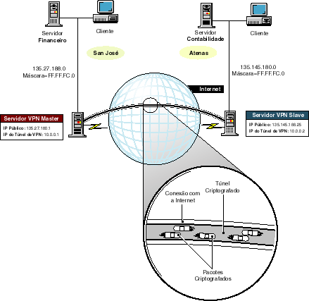 O endereço IP público e a máscara de sub-rede do servidor VPN fazem parte de uma rede local. O firewall possui o endereço IP 200.20.176.12 para a conexão com a Internet. O servidor VPN master possui o endereço IP público 220.150.17.65. A rede local está usando a máscara de sub-rede FF.FF.FF.C0. O servidor slave em Atenas está conectado através de um ISP. O endereço IP público e a máscara de sub-rede são 135.145.188.25 e FF.FF.FC.0, respectivamente.