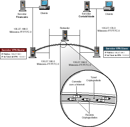 Embora não seja mostrado neste exemplo, os nós da VPN também poderiam ser unidos usando uma conexão ponto-a-ponto e teriam o mesmo endereço de rede.