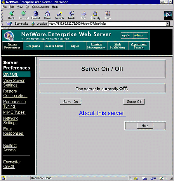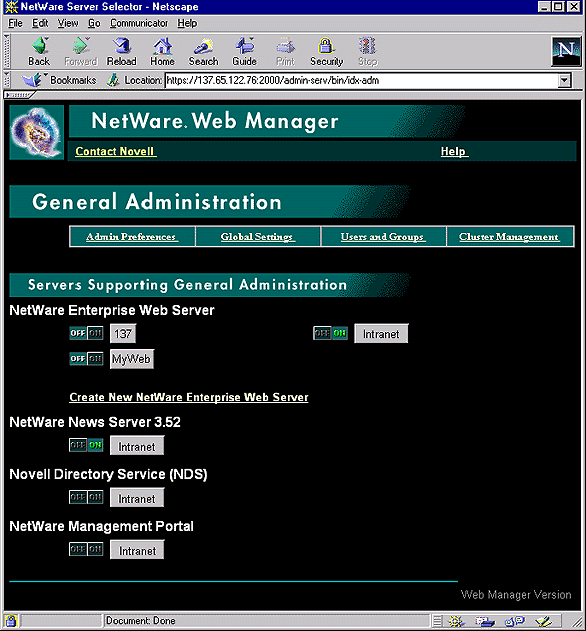 The first page you see when you access NetWare Web Manager is called the General Administration page (see The Server Administration Page). Your General Administration page might look different depending on the Web Services you have installed.