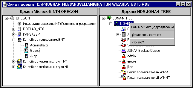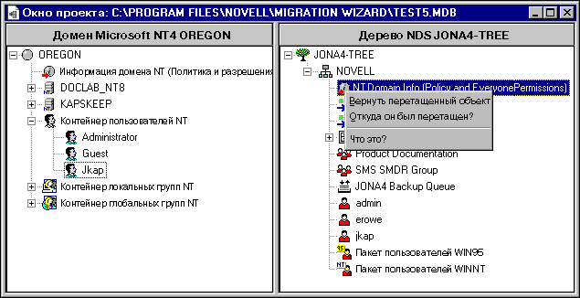 Большая часть работы будет выполнена в окне проекта, где Вы можете перетащить объекты "Пользователь" и "Группа" NT в контейнеры NDS, а папки и тома NT - на любой том или в любую папку целевого дерева NDS.