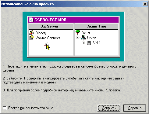 После создания проекта миграции появляется окно проекта и диалоговое окно "Использование окна проекта". На следующем рисунке приводится пример диалогового окна "Использование окна проекта", которое появляется сверху окна проекта.