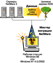 Мастер миграции Novell® NetWare® версии 6 копирует и объединяет Bindery NetWare 3 и файловую систему с одного или нескольких существующих серверов NetWare 3 и помещает их в целевое дерево NDS®.