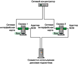 Типичная конфигурация кластера с совместно используемыми устройствами SCSI