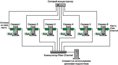 Типичные конфигурации кластера обычно включают совместно используемую дисковую подсистему, подключенную ко всем серверам в кластере. Совместно используемая дисковая подсистема может быть подключена с помощью высокоскоростных карт, кабелей и коммутаторов Fiber Channel или сконфигурирована на использование совместно используемых устройств SCSI. Если на сервере произошел сбой, другие назначенные серверы кластера автоматически монтируют тома совместно используемого диска, ранее смонтированные на сбойном сервере. Это предоставит пользователям сети непрерывный доступ к совместно используемой дисковой подсистеме.