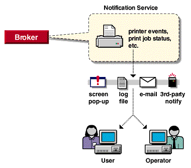 The Event Notification service supports both consumers of events (users) and suppliers of events (printers). Users can register with the ENS by identifying the types of events they want to be notified about, while the printer can register the kinds of events it is capable of reporting. For example, the administrator for a specific printer (by default a Manager of that printer) can designate an Operator to be notified if the printer runs out of paper or if the toner is low. Similarly, users can be notified when their jobs have finished printing.