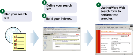 After completing the first task of planning your virtual search server (see Designing Your Search Solution), use the NetWare Web Search Manager to complete the remaining tasks. The following figure illustrates these tasks.