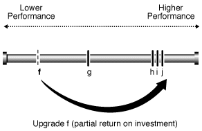 Thus you derive only a partial return on your investment in the upgrade. To accomplish more than moving the bottleneck, both components must be upgraded to the level of h before a full return on investment in h, i, and j can be reached.