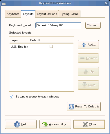 Выберите Вашу модель клавиатуры из раскрывающегося списка, затем воспользуйтесь навигационными кнопками, чтобы добавить или удалить выбранную раскладку из списка доступных раскладок.