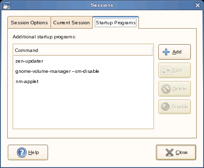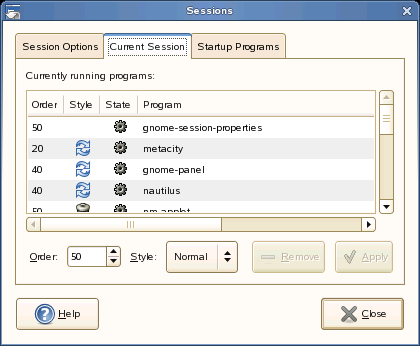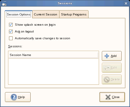 Этот модуль позволяет управлять сеансами. Сеанс начинается с момента регистрации в среде рабочего стола и заканчивается при выходе из системы. Можно задать настройки сеанса и указать, какие приложения должны быть запущены в начале сеанса. Сеансы можно настроить так, чтобы состояние приложений сохранялось в одном сеансе и восстанавливалось при запуске другого.