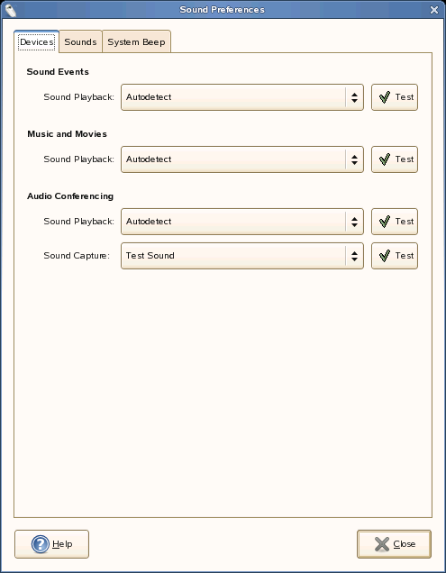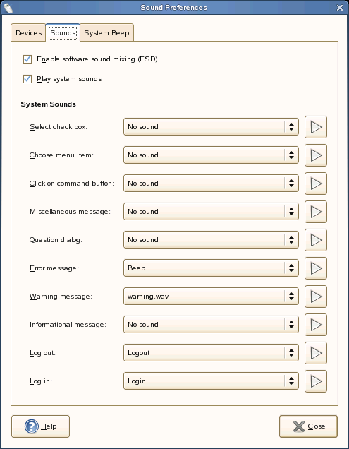 Инструмент "Настройки звука" позволяет управлять моментом запуска сервера звука. Кроме того, здесь можно указать звуки, которые будут воспроизводиться при возникновении конкретных событий.