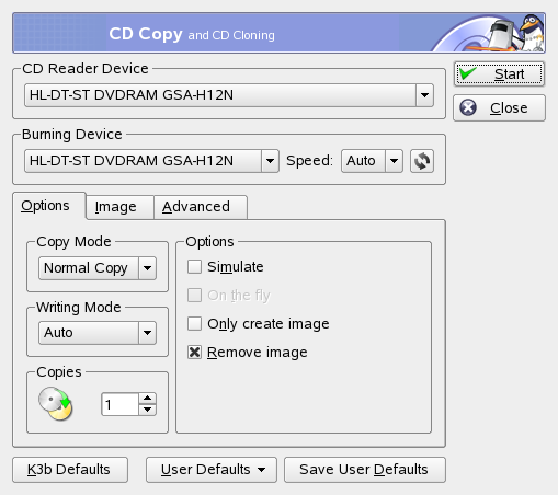 Välj eller beroende på media. Ange inställningarna för läs- och skrivenheten i dialogrutan som visas (se Figur 21-3). Skrivalternativen som beskrivs ovan är också tillgängliga här. Det finns dessutom en funktion som du kan använda för att skapa flera kopior av cd- eller dvd-skivan.