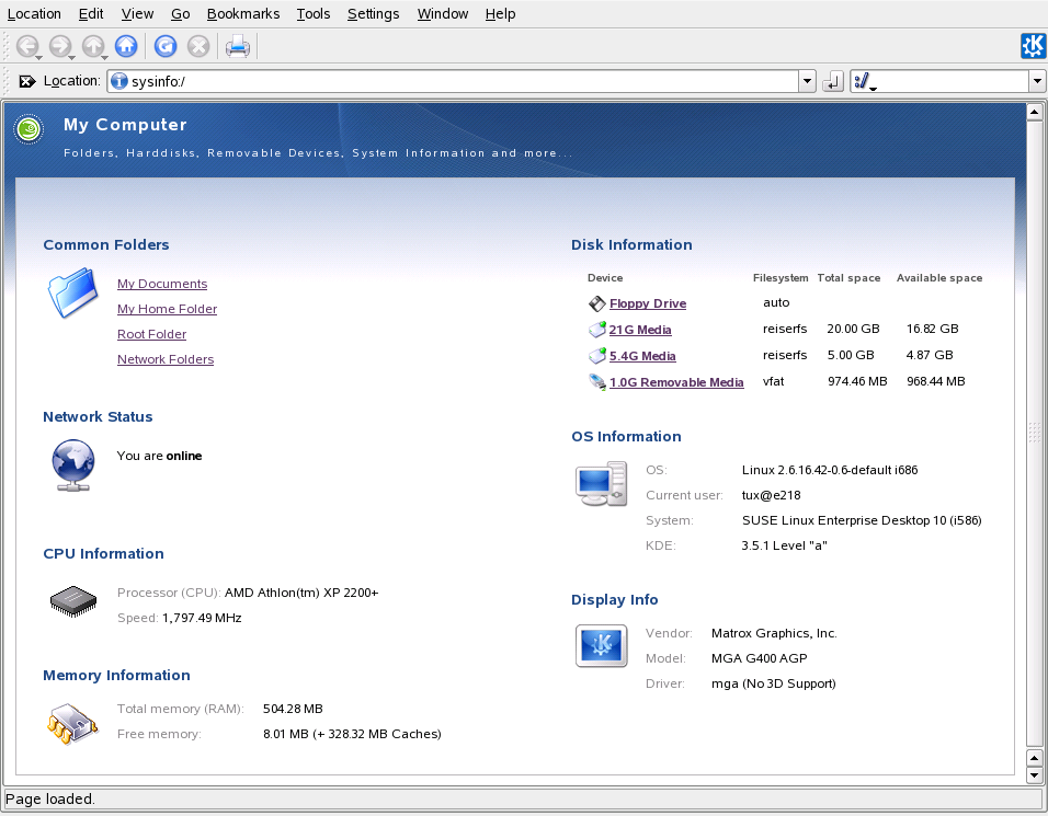 Visar information om maskinvara, nätverksstatus, operativsystem, hårddiskar, delade mappar och flyttbara enheter. Se Område 1.3.3, Få tillgång till flyttbara media om du vill ha mer information.