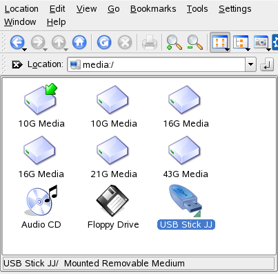 Om du startar Konqueror som filhanterare (se Område 1.4, Hantera mappar och filer med Konqueror) och klickar på i startfönstret eller anger media:/ i platsfältet visas lagringsenheterna i Konqueror enligt Figur 1-10.