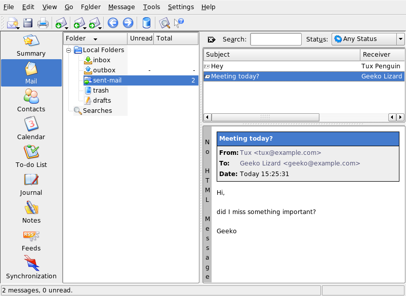 Om du vill importera e-post från andra program väljer du på postvyn i Kontact. Här finns aktuella importfilter för Outlook Express, mbox-format, e-posttextformat, Pegasus Mail, Opera, Evolution mm. Importverktyget kan också startas separat med hjälp av kommandot kmailcvt.