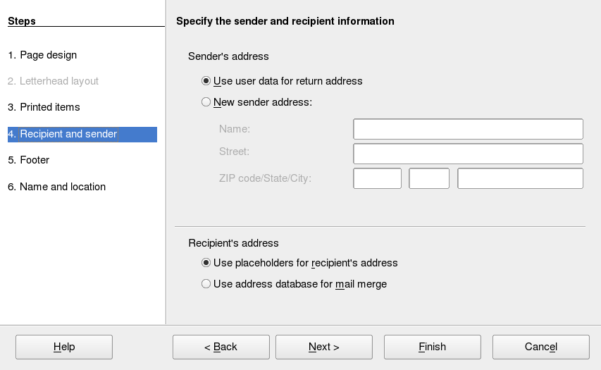 Om du vill använda ett standardformat och fördefinierade element för dina egna dokument, kan du prova en guide. En guide är ett litet verktyg som hjälper dig att efter några enkla beslut skapa ett färdigt dokument från en mall. Om du vill skapa ett affärsbrev klickar du på . Med hjälp av dialogrutorna i guiden skapar du lätt ett basdokument med ett standardformat. Ett exempel på dialogruta i guiden visas i Figur 3-2.