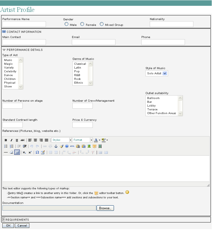 INTRODUCTION: Would your company like to host an event with some type of entertainment? This simple form allows you to record artist information for use during just such and event.