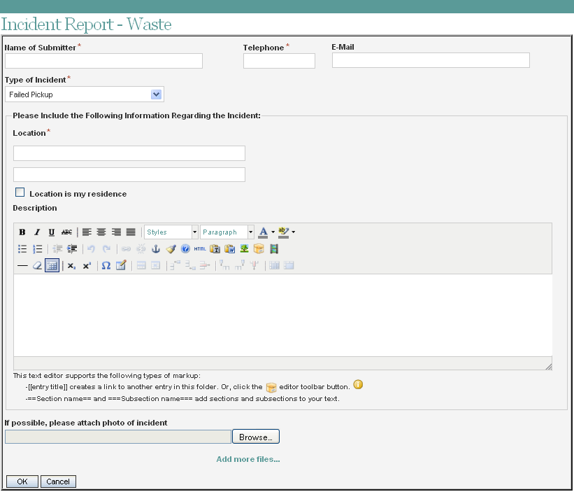 This form and its associated work flow are designed to streamline the work order/ticket process for reporting Waste related incidents. For related incident report forms check out Incident Report - Animal, Incident Report - Traffic, and Incident Report - Water.