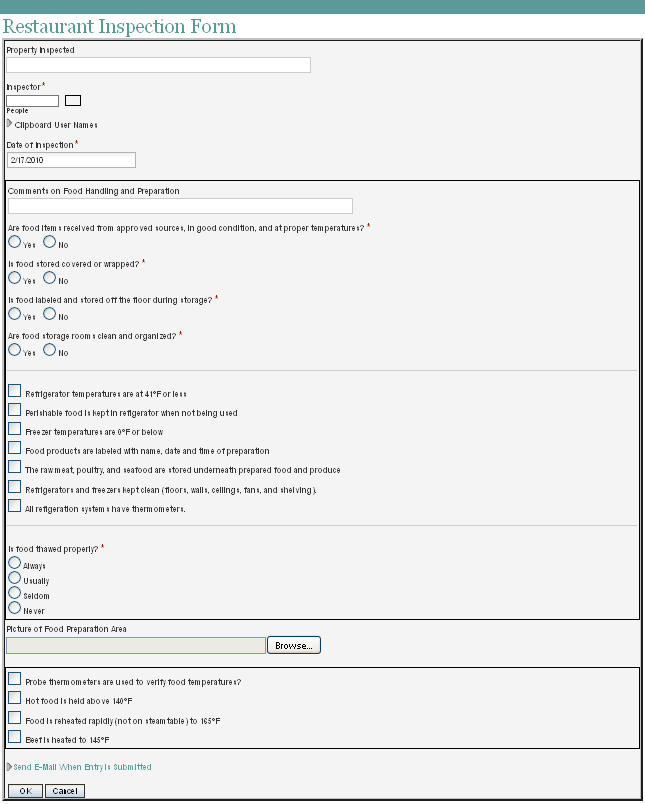 DESCRIPTION: This is the result of efforts made by members outside the Factory. It is a very practical use for a Teaming form and workflow in a unique venue. This form can be customized to meet the needs of your business. You can select the inspector from a list of your employees. You can also modify any requirements based on specific regulations in your area.