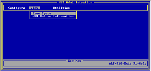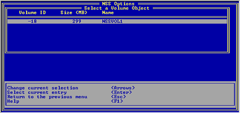 This option displays information about existing NSS volumes: the Volume ID, size, and NSS volume name.