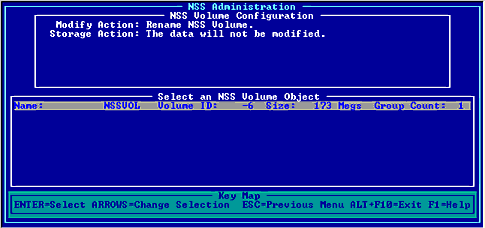 To increase the data capacity of your existing NSS volume, do the following: Enter nwconfig at the server console. NSS loads automatically with NWCONFIG. Select NSS Disk Options. Select NSS Volume Options. Authenticate to NDS by entering your full login name and password. Select Modify. Select Increase NSS Volume Size. Select an NSS volume. Select an available storage group. Select Yes to confirm your decision. To increase the data capacity of your existing NSS volume, do the following. This task lets you change the name of an existing NSS volume. To rename an NSS volume, do the following: Enter nwconfig at the server console. NSS loads automatically with NWCONFIG. Select NSS Disk Options. Select NSS Volume options. Authenticate to NDS by entering your full login and password. Select Modify. Select Rename NSS Volume. Select the NSS volume to rename. Enter the new name of the volume. Select Yes to confirm your choice. The NSS volume will be renamed in NDS. To rename an NSS volume, do the following: Load NSS. Open the NSS Administration menus. At the server console prompt, enter nss /menu to open the menus. From Configure, select Modify. Select Rename NSS Volume. The following screen appears. Figure 14