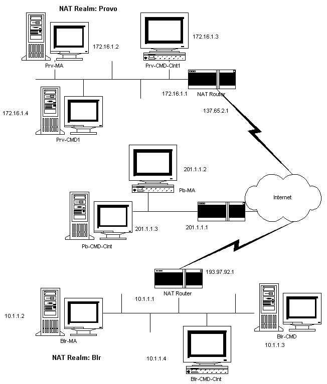 The following diagram is an example on how NAT support can be implemented. The CMD network spreads across the intranet (which uses the private addressing scheme) and Internet (which uses the public addressing scheme). A network with NAT enabled at its border is called a private realm. The network may or may not use private IP addresses. The Internet is called a public realm. A realm should be assigned a unique name. The next figure depicts two private routing realms, BLR and Provo, connected by a public realm to the Internet. To enable CMD communication between BLR and Provo, use the options mentioned in Configuring CMD to Support NAT.