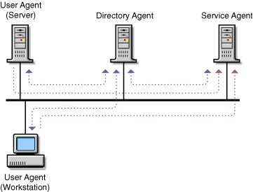 The following figure illustrates how SLP registers a service provider on a local segment. Each agent must register its own services. Whether the User agent is on the server or on a workstation, it can register as a client after it communicates with the Directory agent to see what services are available. Once the service is registered with the Directory agent or Service agent, you can register or deregister the service.