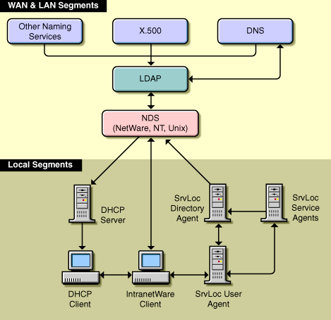 A Novell client can use the User agent to go into an SLP Directory agent or Service agent, or into NDS to reach out to other LAN or WAN segments, as shown in Figure 2.