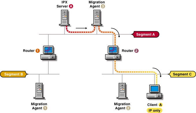 The following figure shows a client installed as IP only in Segment C trying to communicate with an IPX server in Segment A. The IPX server knows that the client is part of the virtual CMD network and that Routers 1 and 2 present equally efficient paths to the CMD network server (the Migration Agent servers present the CMD network route to the routers attached to their network segment).