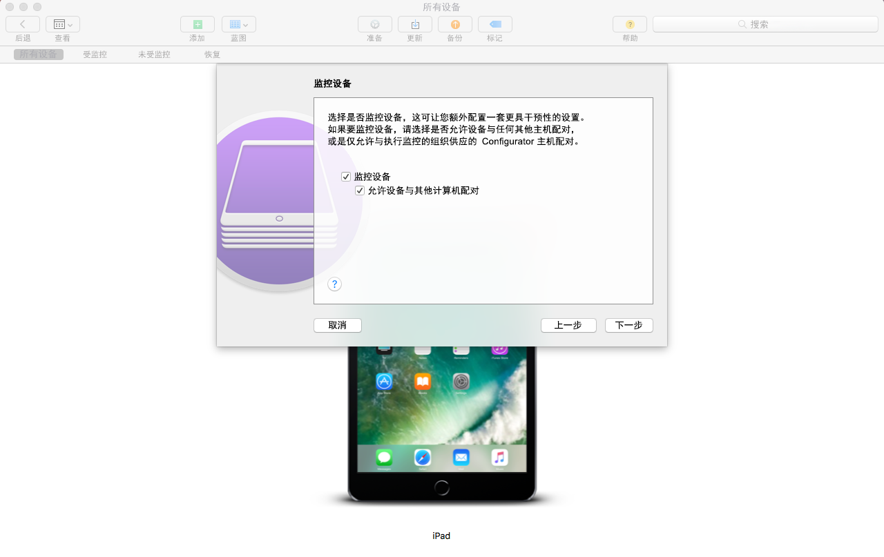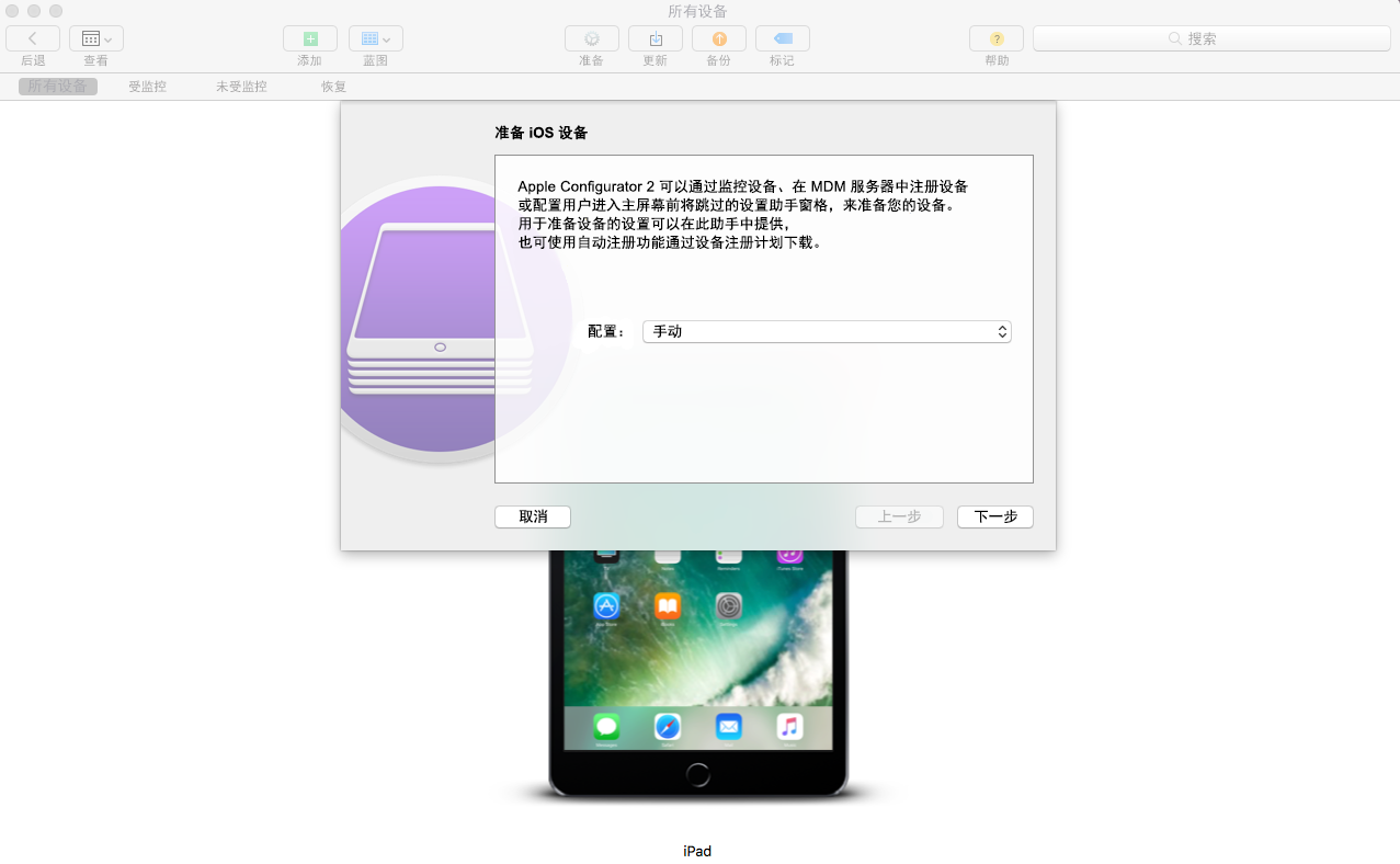 单击右键并选择准备,或选择 Apple Configurator 顶部菜单栏中的准备。