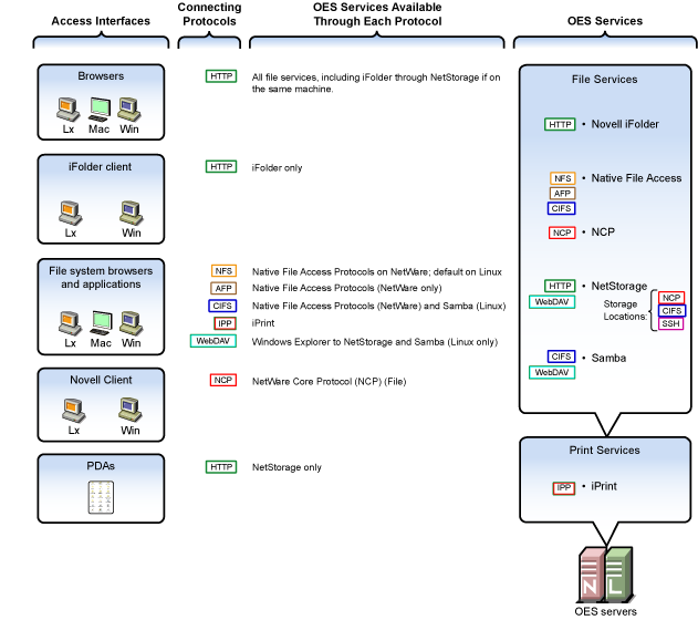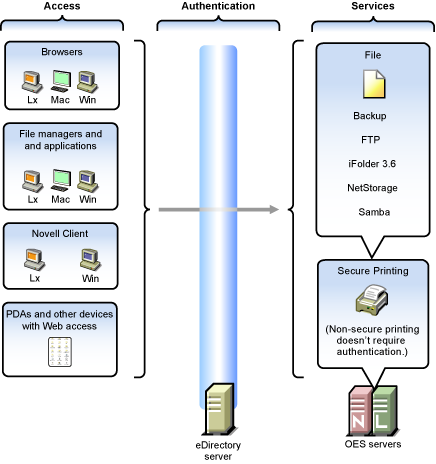 圖 16-1 說明 OES 2 服務支援的存取方法。Novell® eDirectory™ 為每個服務提供驗證。