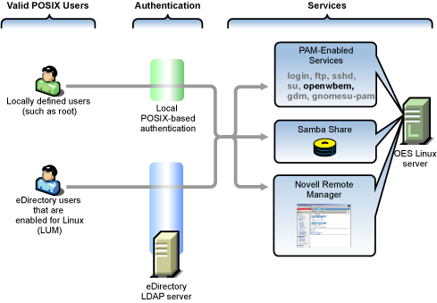 圖 15-1 說明 Linux 使用者管理如何控制 OES 2 伺服器的存取權。