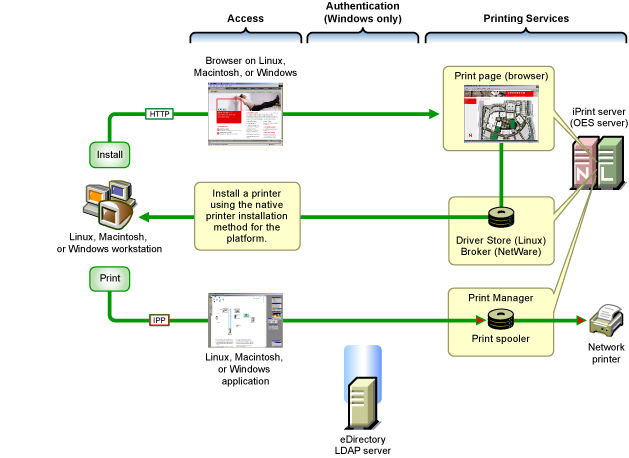 如果您已經知道要提供 OES 列印服務給使用者,而且也瞭解 iPrint 如何運作,請略過綜覽並繼續使用節 18.2, 列印服務的規劃。